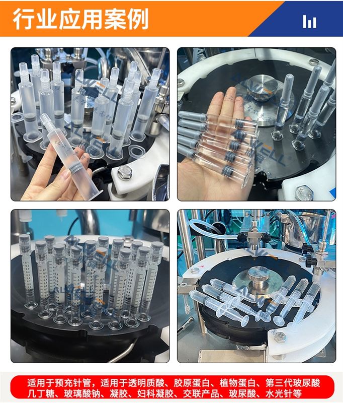 预灌封胶原蛋白原液灌装机:该设备是我司专门针对塑料注射器和预充式针管设计的自动化灌装封口机。能实现全自动上管、离心式理管,灌装、旋帽,且可对接灯检、灭菌摆盘、加杆、贴标、检重、枕式包装机等组成全自动流水线。整机伺服控制,结构稳定,适用于多种规格的注射器产品,适用于生理盐水、氯化钠、几丁糖、牙科凝胶等物料的灌装,广泛应用于各种生物制药、牙科等行业。